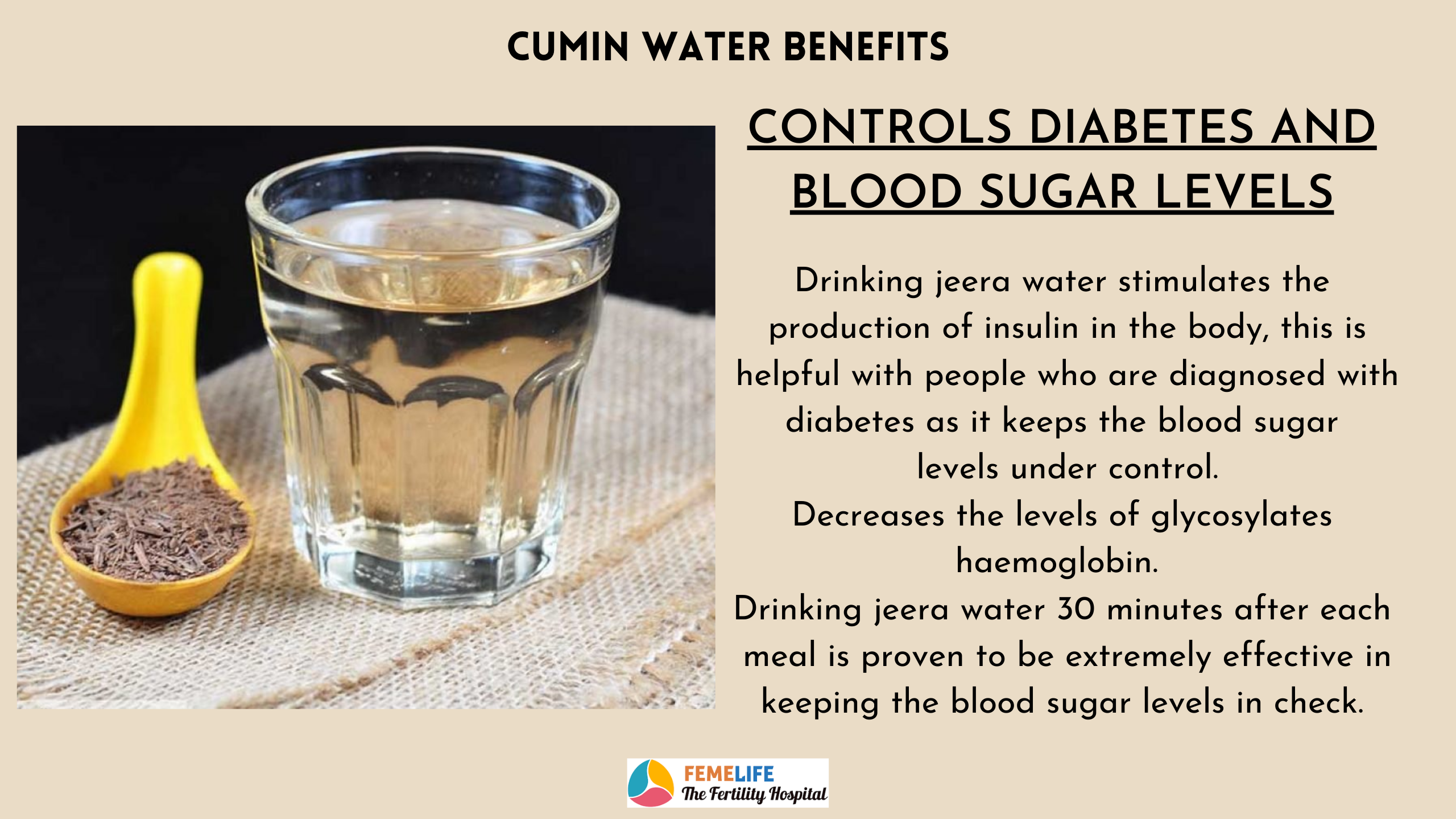 Insulin sensitivity is improved by drinking jeera water. It prevents blood sugar rises and hence aids in the control of type 2 diabetes mellitus.