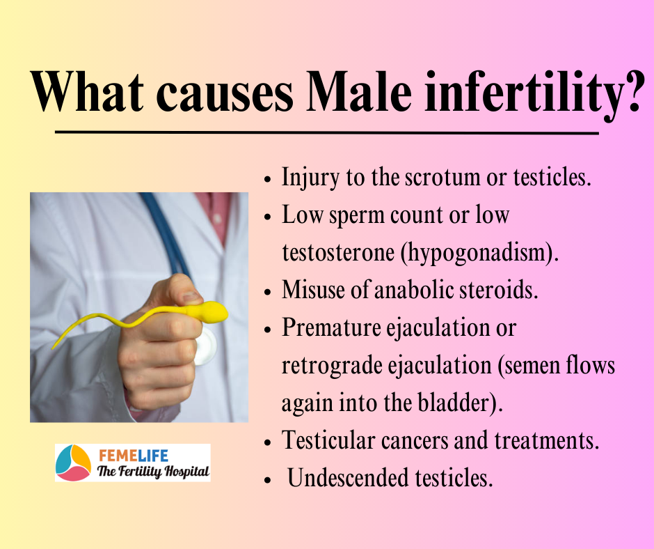 Male factor infertility can be caused by low sperm production, abnormal sperm function or blockage that prevents delivery of sperm. Illnesses, injuries, chronic health problems, lifestyle choices and other factors may contribute to male infertility.