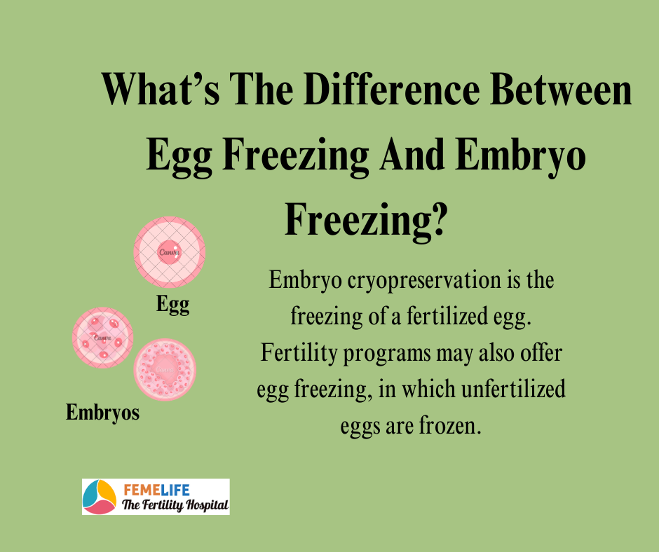 A fertilized egg is frozen during embryo cryopreservation. Fertility programmes may also provide egg freezing, which is the freezing of unfertilized eggs.